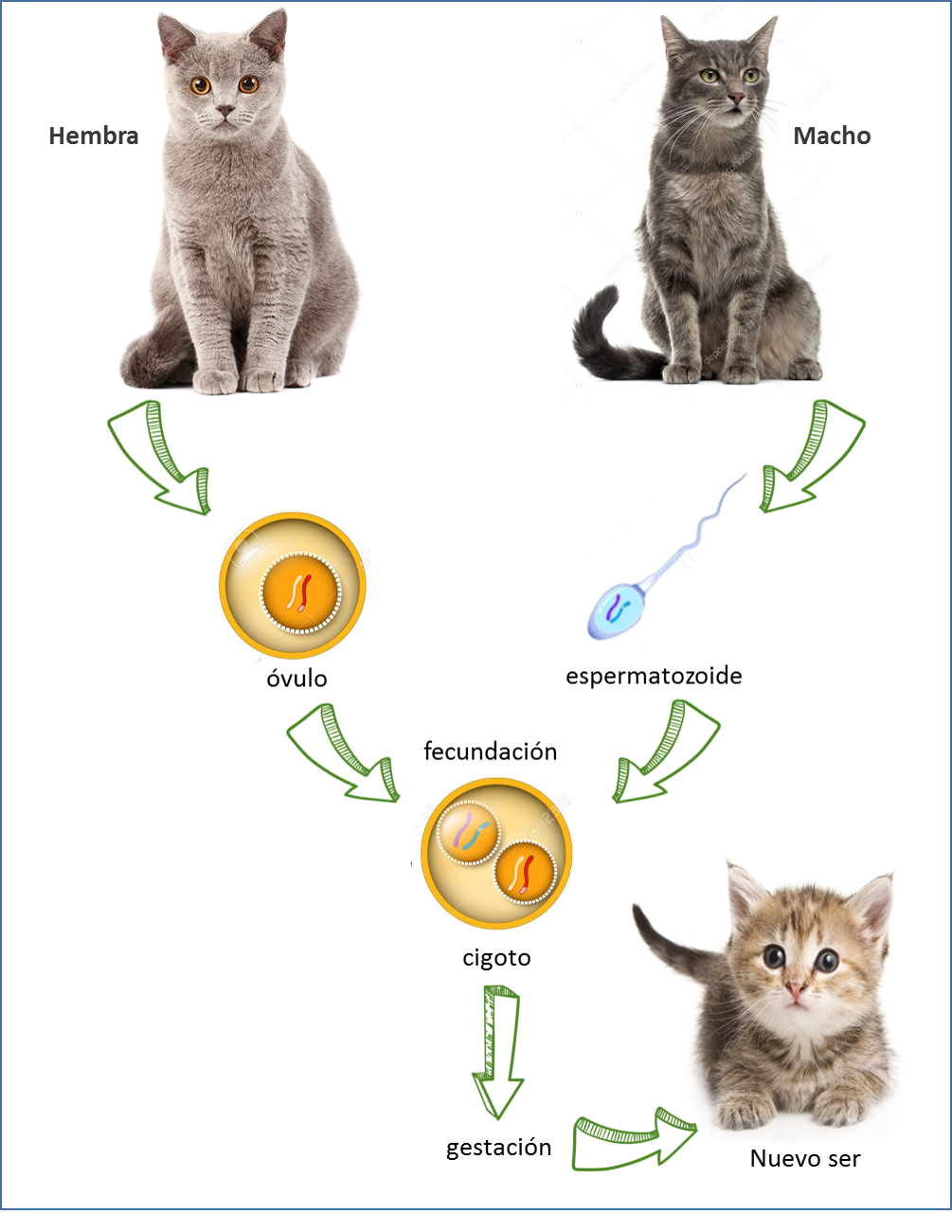 La reproducción sexual ocurre cuando las células reproductoras femeninas se combinan con las células reproductoras masculinas para formar un nuevo animal que es una combinación genética de los animales del padre.