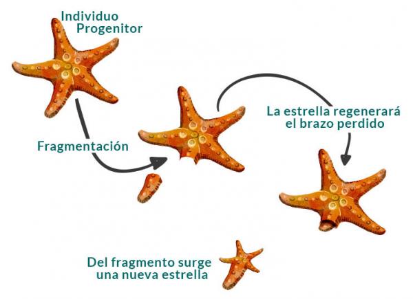 La regeneración ocurre cuando parte de un animal se rompe y el animal lo vuelve a crecer. A veces, si la parte que está rota es lo suficientemente grande, también puede convertirse en otro animal. Los equinodermos como las estrellas de mar son un ejemplo de animales que se regeneran.